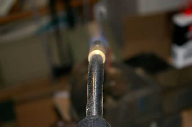 Antes de poner distancia del soplete, el aro de plata en el anillo de latón de la soldadura. El latón requiere más calor para llegar hasta la temperatura de soldadura y no te preocupes deslustrar el bronce o la plata. el enfoque principal aquí es acertar con la ubicación - si consigues wonky, te mira raro cuando haya terminado.