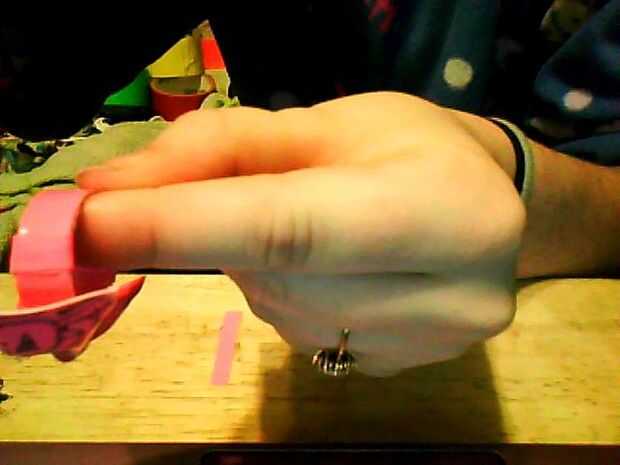 Ponga la banda en su lado de proa del dedo para arriba. El tamaño de las aletas a su dedo y donde terminan. Cinta adhesiva con un pequeño pedazo de cinta de abajo.