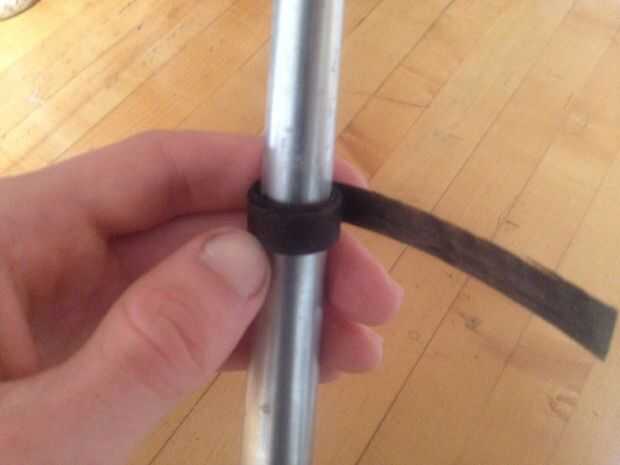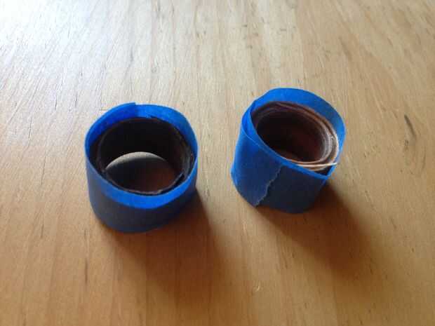 Después de empapar la chapa, tomar con cuidado la madera fuera del agua caliente. Limpie el exceso de agua con una toalla de papel y envuelva la chapa alrededor de un objeto redondo similar o superior entonces la forma final deseada. Usé un mandril (una herramienta de tamaño de anillo). Puede usar cualquier cosa de un pasador, tapa de la botella, grueso marcador o resaltador, etc. Una vez que usted ha envuelto alrededor de su molde, utilice un trozo de cinta adhesiva para mantenerlo en esa posición y eliminar de su plantilla. La chapa debe secar en esta forma durante unos 8-12 horas.