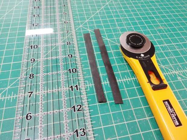 Usando un cortador rotatorio y regla corté dos tiras fueron 3/8" ancho.
