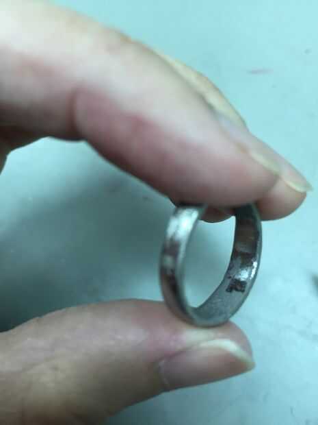 No pulir la superficie interna demasiado o podría obtener demasiado flojo. Se adapta a mi original anillo en mi dedo pulgar y comprobar ajuste de nuevo el anillo de esa manera. Cos sería mejor consultar en el destinatario del anillo.