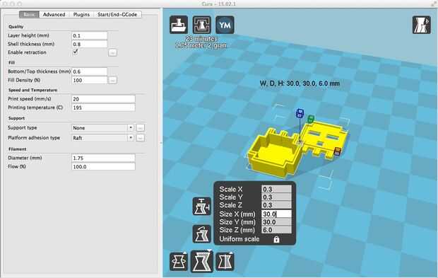 I caja de cráneo puede encontrarse en http://www.thingiverse.com/thing:121972. Imprime en 2 piezas (tapa y caja) y broches juntos para hacer un compartimiento poco oculto. Usé una balsa para el soporte de impresión en la mía, sólo para que la pequeña parte sería menos probable que enrollamiento y deformación (ya que las 2 piezas encajan perfectamente, menos deformación mejor). Mina escala hasta 30 mm en el eje de x (que es para ambas piezas, así que básicamente en mitad de cada parte de la caja). Imprimí en la resolución más alta que mi máquina imprimiría (100 micrones) y lento (20 mm/segundo) para ayudar a mantener el detalle y llena de densidad al 100%. Usé blanco translúcido filamento PLA, y parece que saca bien a 195 grados centígrados.