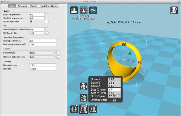 El modelo para el anillo puede encontrarse en http://www.thingiverse.com/thing:167081. Escala el anillo hasta 17 mm en el eje x ya que este iba a ser para mi dedo meñique de hijos. Esto puede ser tamaño a lo que le cabrá mejor aunque, y el cráneo puede ser de un tamaño arriba o hacia abajo en consecuencia. Te darás cuenta de que añadí un soporte de borde en el anillo (sólo para asegurarse de no caerse durante la impresión, probablemente hubiera sido aceptable sin él aunque). Guardó los otros ajustes del cráneo del mismo (llenar densidad al 100%, velocidad de 20 mm/segundo, altura de la capa a 100 micrones etc...). Tuve que girar el anillo de modo que el lado plano se hacia abajo en la placa de construcción como se imprimirá mejor en esa orientación, pero aparte de que tuve que hacer nada para ese modelo.