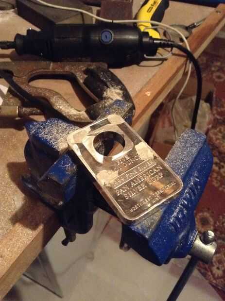 Perfore un agujero en la plata hay un montón de sitio para tallar hacia fuera los dientes y la piedra. He perforado un agujero en el centro de la mitad superior de la barra y había ampliada a partir de ahí.