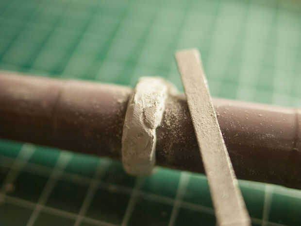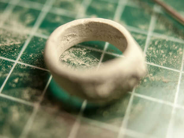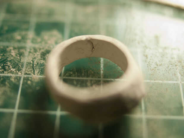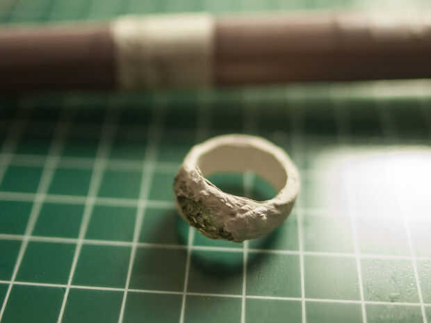 Cuando el anillo esté seco puede retocar/llenar puntos simplemente añadiendo algunos arcilla extra. Si tienes que puede usar una pistola de aire caliente para secar los retoques porque el resto del anillo ya se seco.