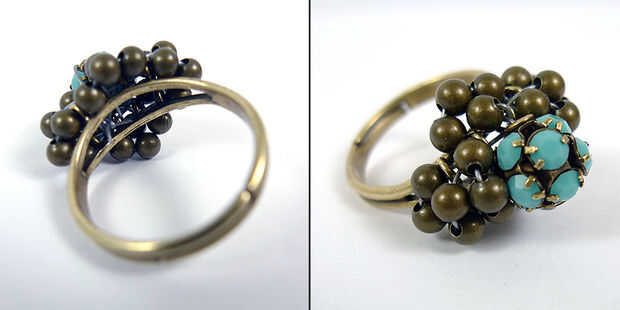 1 alimentación del grano en el cable y alimentación a través del anillo debajo del talón rhinestone. 1 grano sobre el alambre y la alimentación hacia atrás a través de debajo el grano de diamante de imitación de la alimentación. 3 bolas en el cable de alimentación. Alimente el alambre hacia atrás a través del anillo y 3 bolas en el cable de alimentación. Llevar ambos extremos del cable debajo del ring, tira alambre firmemente y nudo juntos firmemente. Coloque una pequeña gota de pegamento sobre el alambre anudado y recorte cerca.