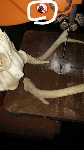 Retire cuidadosamente las cornamentas del cráneo con la Sierra de cinta... HACER seguro de que son extremadamente cuidadoso es muy fácil tener un accidente y tienes que ir a la sala de emergencia... lo que me sucedió al tiempo que... me dio 6 puntos de sutura.
