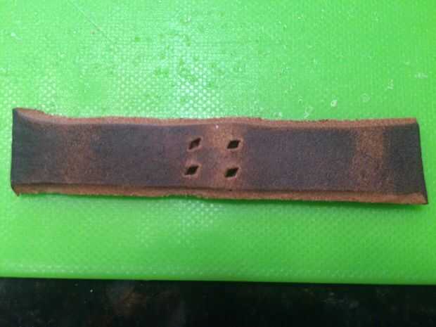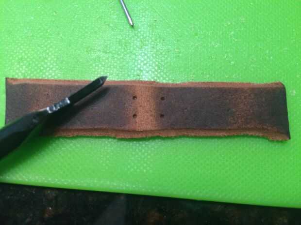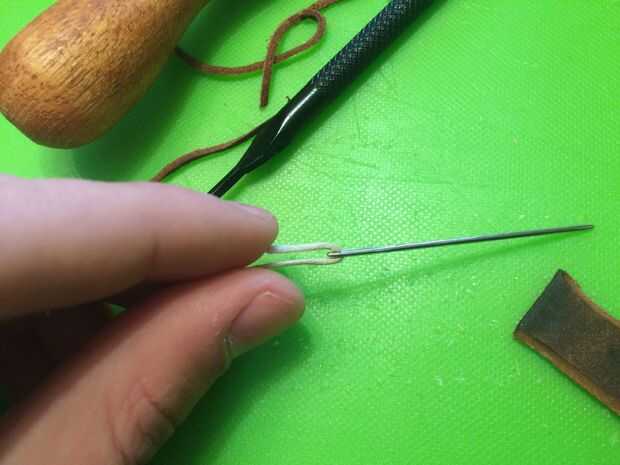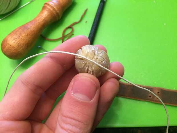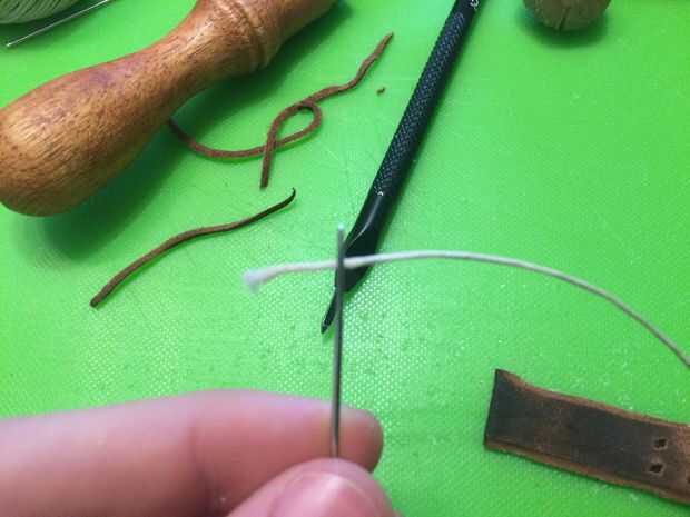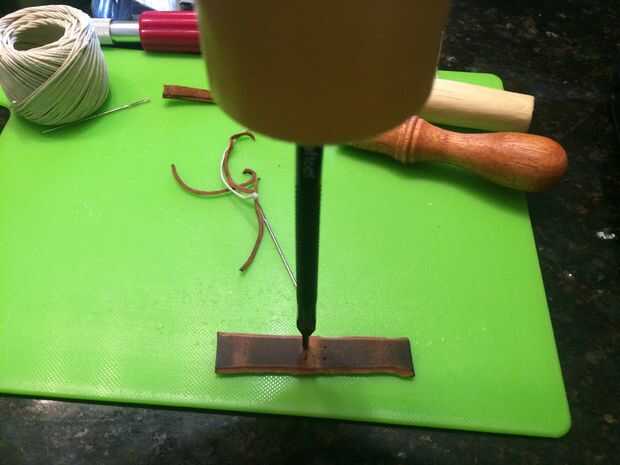 Si desea agregar un diseño a tu anillo, ahora es el momento para hacerlo. Estoy haciendo algunos costura decorativa en mi anillo en forma de una X, pero no dude en utilizar sellos o tallado para decorar. Marque los orificios de costura que va a utilizar con el punzón o clavo. Luego colocar el punzón en el agujero y utilice el martillo para golpear a través de la piel. Una vez todos los agujeros puede empezar a coser. Me gusta a mi hilo de cera a mano con cera de abeja antes de costura, pero esto es opcional. Yo solo tire del hilo sobre una bola de cera hasta que está recubierto en cera. Ahora empuje el hilo a través de una aguja y apriete contra sí mismo. Creo que esto mantiene el hilo de rosca lo suficientemente seguro como para unos puntos que es todo lo que necesito. Ahora Enrosque el otro extremo de la misma manera con la otra aguja. Si en cualquier momento usted es confuso una pregunta en los comentarios o se refieren a los cuadros