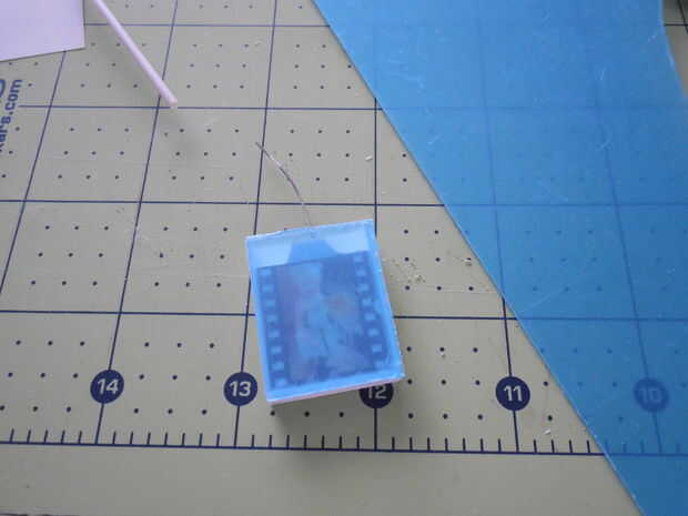 Ahora con un poco de pegamento en los bordes de la cara, pegar sobre la pieza de clara, luego pegamento en la tira de estireno (.040 x.156) x. 980" esta pieza se pega solo al marco de estireno blanco no para claro, véase el cuadro, este espacio es donde irá la diapositiva de imagen.