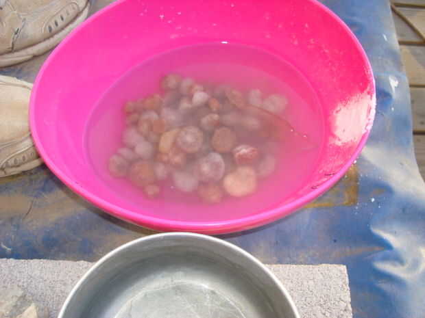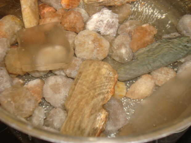 Rompió y lavar los diamantes con el blanqueo de madera. Ayudó pero todavía tienen algún tipo de depósito mineral y el hierro un poco así que no estoy seguro de lo que en ellos a la izquierda. Yo estaba buscando una mirada más clara del diamante. Después de uso del baño de blanqueo y enjuagar los diamantes bien me calienta una cacerola con agua y agrega los diamantes. Los calienta a fuego lento durante un par de horas. Esto quita más indeseados minerales se pueden ver en la izquierda están los diamantes limpios y a la derecha están los diamantes como los encontré.