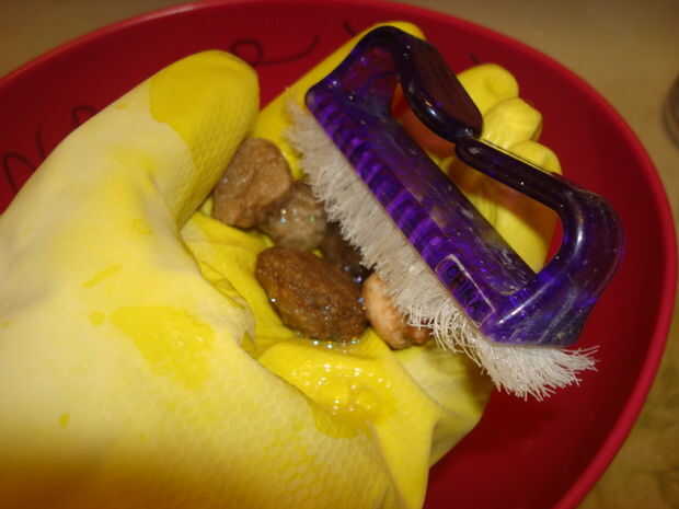 Limpie los diamantes con un buen jabón de limpiador o un plato y un cepillo.