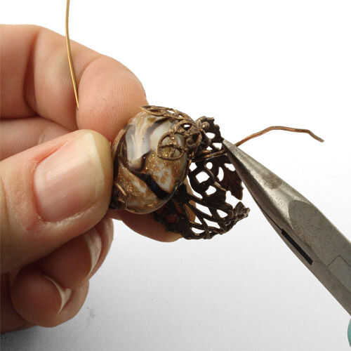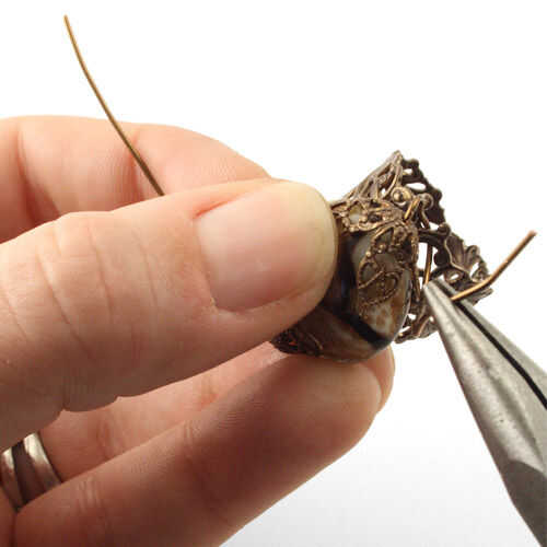 6. Coloque el talón en la base del anillo. Utilice alicates de cadena para introducir un extremo del hilo entre los puntos principales de la filigrana y a través de la abertura al lado de él.