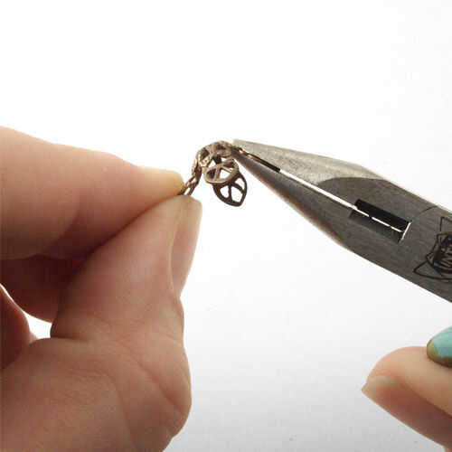 3. use pinzas de punta de cadena para abren los pétalos de 12 mm filigrana casquillo del grano, para caber firmemente sobre el grano del disco. Repita para un total de 2 Casquillas y cascarillas.
