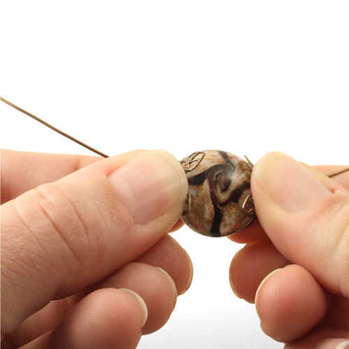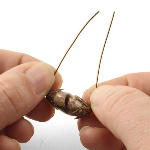 4. cortar 5" pedazo de alambre de 20 g y cadena las siguientes; casquillo del grano, grano de disco, casquillo del grano. Presionar piezas juntas en el centro del alambre y forma el casquillo del grano a la forma del talón con los dedos.