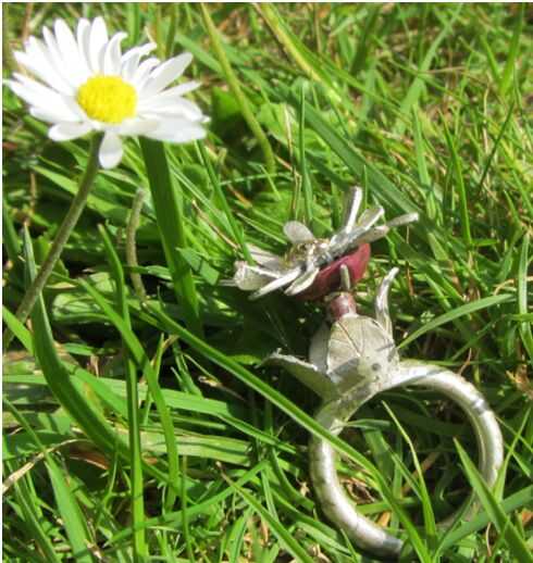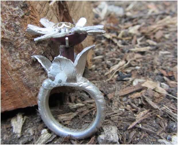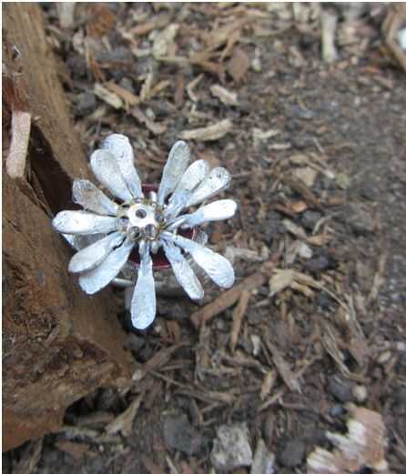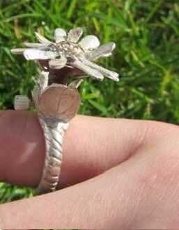 He diseñado mi anillo para mirar un poco como una margarita con un montón de pequeños pétalos de plata crecen de un tallo sostenido por hojas de metal, pero así como mi diseño voy a como se pueden hacer flores de diferente color y forma.