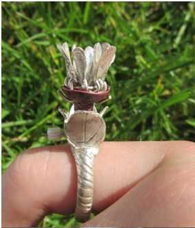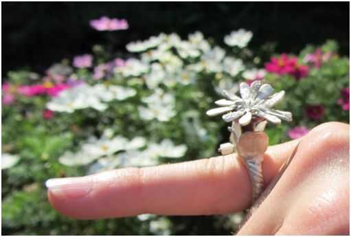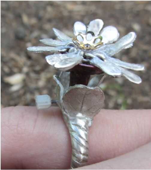 El anillo comienza como un brote, pero cuando el pequeño botón en el lado del anillo se retuerce suavemente los pétalos de plata bajar al unísono, creciendo lentamente en una flor metálica.