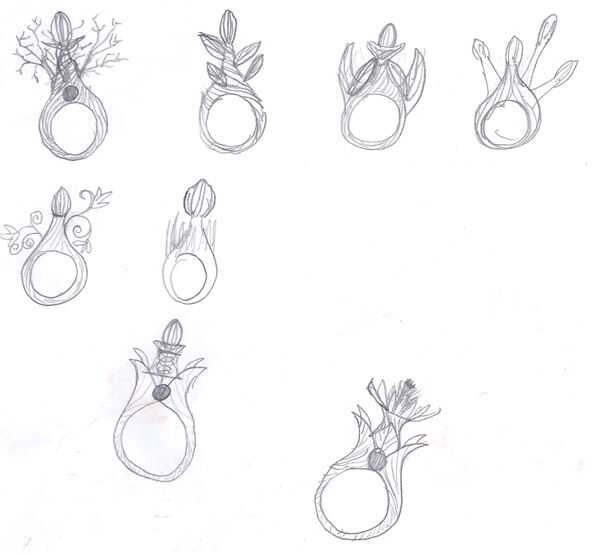 Mi diseño final consistió en una hoja base para el anillo donde saldria un tallo de suspender la yema y la flor.