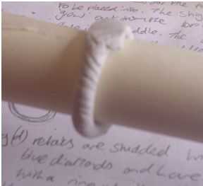 6) tomar un alfiler y hacer lo que te gusta en el anillo mientras está todavía los patrones. Hice un patrón espiral ejecutando el pin en líneas diagonales hacia abajo el anillo como se puede ver en la imagen.