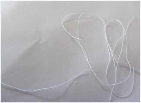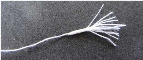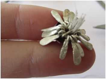 2) luego corte 15 (u otro dependiendo del tamaño de sus pétalos) pequeñas longitudes de hilo, de unos 4 mm de largo y pegarlas haciendo rodar entre sus dedos y superglueing a un filamento más largo para hacer algo como la imagen de arriba.