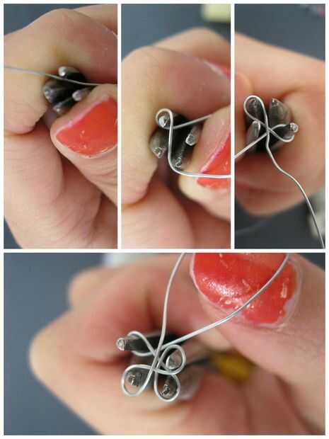 En trabajo de alambre, a veces se utiliza una plantilla para hacer uniformemente espaciados y bucles de tamaño. Plantillas generalmente parecen un tablero con los pernos que sobresale en una cuadrícula. El concepto es básicamente poco postes de anclaje para envolver el cable alrededor. Desde calibre 26 cable es relativamente suave, simplemente puede mantener 2 pinzas en una mano y envuelven con la otra mano. Sujete las pinzas con las puntas apuntando hacia arriba para que pueda ver las cuatro puntas alineadas en una plaza. Esta es su plantilla. Ahora coge el alambre de longitud 2 dedo desde el extremo y empezar a envolver la figura ochos con el extremo corto.