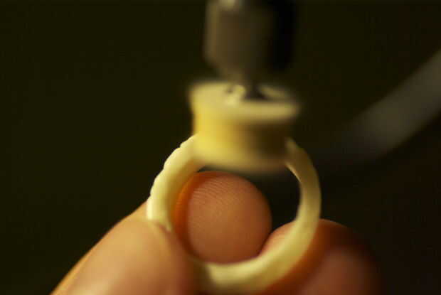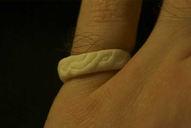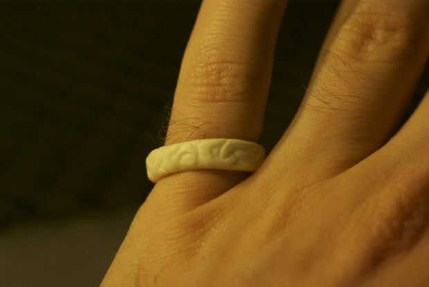 hice mi anillo de nueva centavos, derretido abajo y fundido en un molde negativo con una forma positiva hecha sobre una impresora 3d de la arena, siguiente usé una dremel para tallar un agujero que cabría las vértebras de una serpiente de cascabel de