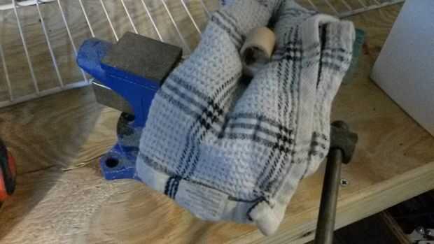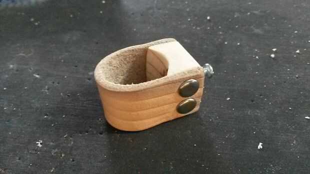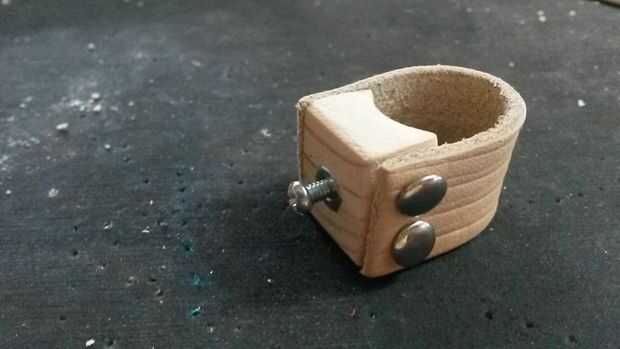 Poner el anillo en una prensa o abrazadera para presionar los remaches en los agujeros firmemente mientras el pegamento seca. Utilice un trapo o un pedacito de tela para mantener la textura del vicio de impresión sobre el cuero.
