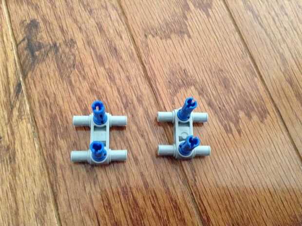 Dos de las extrañas piezas gris y poner las larga azules clavijas en los agujeros. A continuación, la pila otra pieza gris en la parte superior.