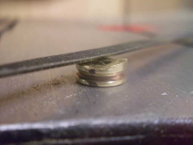 Ahora, arena o presentar el trasero de la cáscara de bala por lo que encaja perfectamente en el anillo. Esto puede ser difícil, pero hará que se vea muy bonito. Está bien si su no perfecta solo que hagan su mejor esfuerzo.