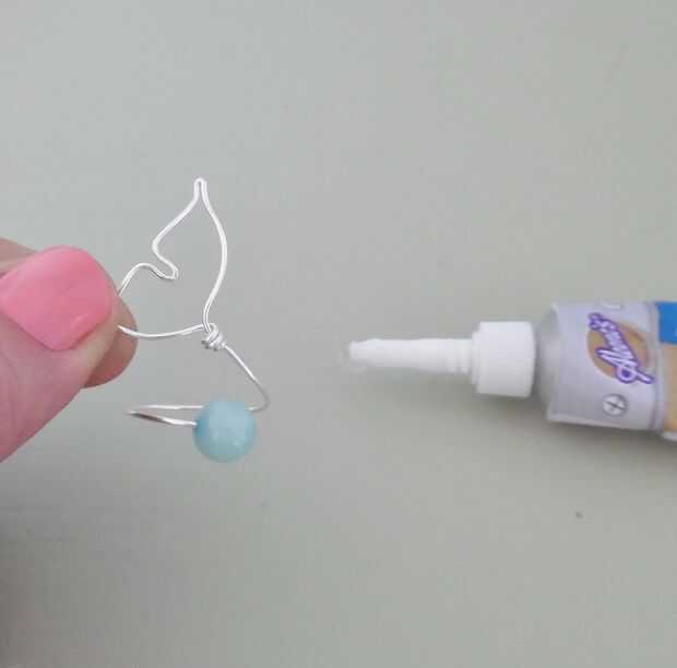 Poner un pequeño toque de pegamento en el extremo del alambre de corte. Deslice su talón, asegurándose de limpiar cualquier exceso de pegamento. (FYI colas más salen el tubo claro, pero se seco blanco! Vale la pena los pocos segundos extras para asegurarse de que usted limpie cualquier pegamento ya que es muy difícil de quitar una vez se ha secado.) Deje que el pegamento seco durante al menos 20 minutos.