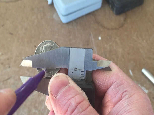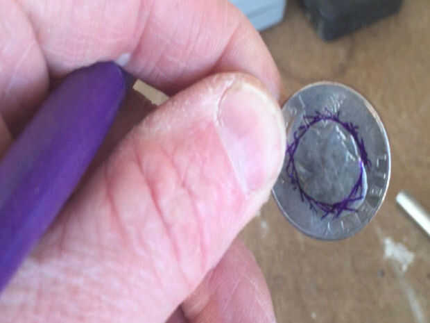 Con el conjunto de la pinza, establecer la moneda en el borde de la pinza y trazar una línea, gire la moneda aproximadamente 15 grados y dibujar otra línea. Una vez que han movido la moneda en los 360 grados que debe dejarse con un círculo centrado completamente listo para golpear hacia fuera. Si desea ver una demostración mejor de este paso, vea el video.