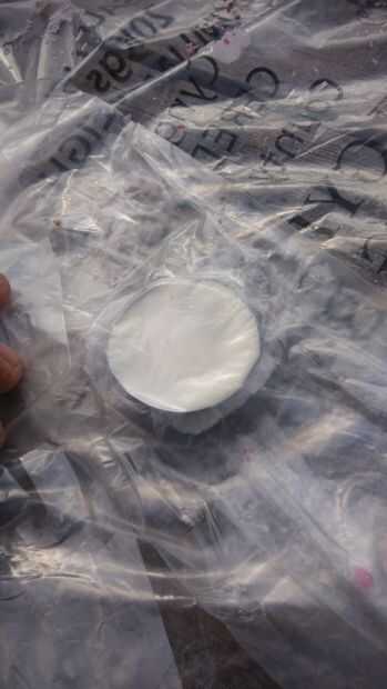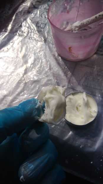 Coloque una bolsa de plástico (yo usé una bolsa de reciclaje) en la parte superior de la oogoo. Con los dedos, suave oogoo en la parte superior del molde y presione suavemente para aliviar cualquier airbubbles en la mezcla.