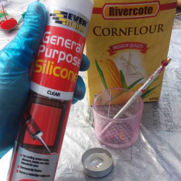 Usted necesitará exprimir algún sellador de silicona del tubo (suficiente para llenar el cuerpo de la vela) en a la mezcla de la tina. A continuación coge la cuchara y pala un volumen aproximadamente igual de harina de maíz en aswell.