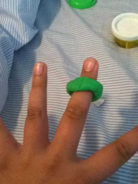 Sorry for bad quality this is on my ipod 1. Empezar haciendo lo play-doh necesita una blanco pequeña y un montón de verde 2. Conseguir un trozo de verde un rollo en forma de serpiente 3. Obtener la herramienta de corte y corte los bordes redondos para un aspecto cuadrado 4. Aplanar la serpiente con el envase de la plastilina 5. Envuélvalo alrededor de su dedo y el espesor del anillo 6. Haz un pequeño trozo de verde y aplanarla y cortar la insignia de linterna verde 7. Obtener la pieza blanca y aplanar hacia fuera un puesto el logo en 8. Poner junto y déjelo secar durante la noche!