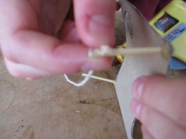 ahora Coloque un poco de pegamento en la parte superior de cualquier poste y coloque el extremo de una de las cadenas en el pegamento. Seguiremos los cuatro puestos y final en el que empezaste. corte cualquier exceso de cordel. Hacer lo mismo otra vez para la segunda cadena justo debajo de la primera de ellas.