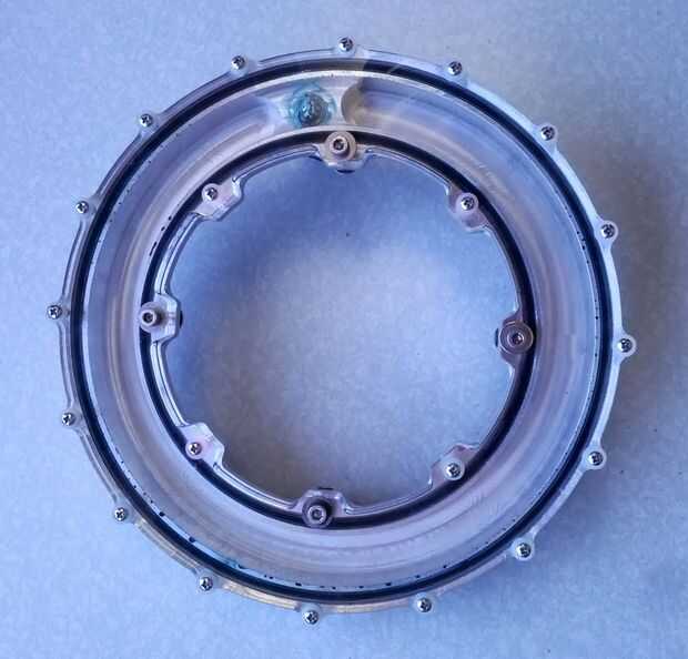 Cuadro 4 muestra un primer prototipo del nuevo anillo de luz. Es una cubierta de aluminio con una cubierta de acrílico y algunos anillos. En esta foto, apenas habíamos caído el anillo de luz del lado de un bote de 400 metros (600 psi... creo que pocos coches aparcados en un CD). Habíamos aplicado tinta de color diferente a cada superficie de sellado para comprobar si hay fugas. Hubo el movimiento de la tinta pero no hay agua, por lo que funciona como una prueba de concepto.