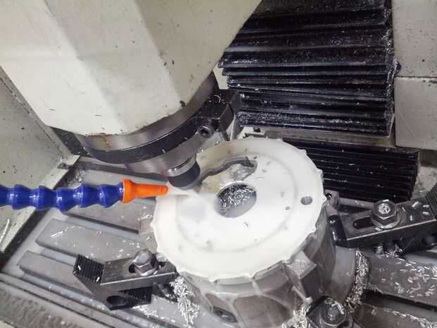 Aquí están algunas fotos de acción. En el cuadro 1, la máquina está cortando la brida interior. En el cuadro 2, la máquina es vaciado el bolsillo (y generar un lote de chips). En el cuadro 3, la máquina acaba de terminar golpeando ligeramente un agujero. Golpear ligeramente significa agregar hilos de rosca, como para un tornillo.