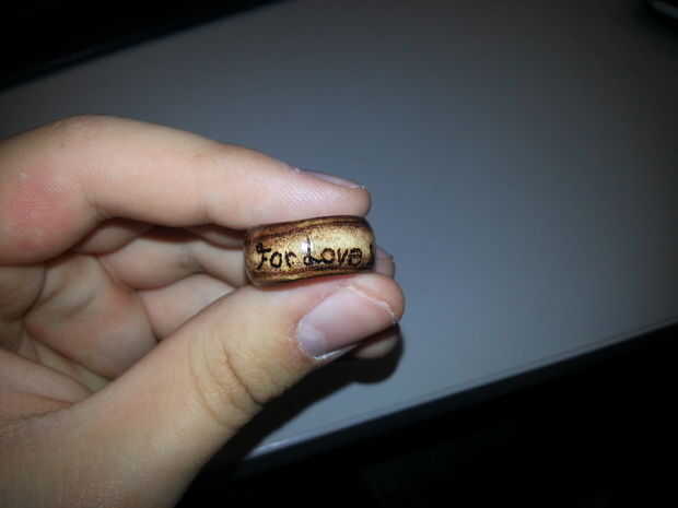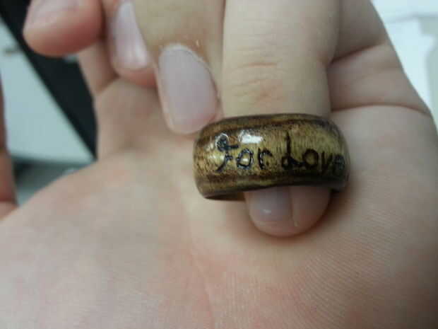 Después de quemar meticulosamente mi mensaje en el anillo, le di la capa de brillo final, y las dos fotos finales son el resultado.