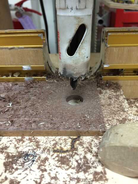 Una vez que taladre el agujero inicial, vas a cambiar a la broca forstner con un serrucho. No mueva la madera, porque la sierra necesita permanecer en el mismo punto de centro. Las sierras de tamaño que elegí hacer mi banda de 1/8" de espesor. Así que el anillo es fino lo suficiente como para sentarse en mi dedo cómodamente pero no demasiado fina para el agujero vio masticar mi material. Perforar lentamente. Estoy usando la nuez que es una madera densa, por lo que la sierra no mastica para arriba tan fácilmente como diría en madera contrachapada, o una madera más suave.