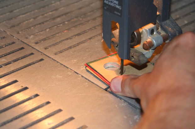 Luego, use una sierra de banda para cortar con cuidado la forma áspera de su anillo, dejando ligeramente más grande que deseado que puede ser lijada suave.