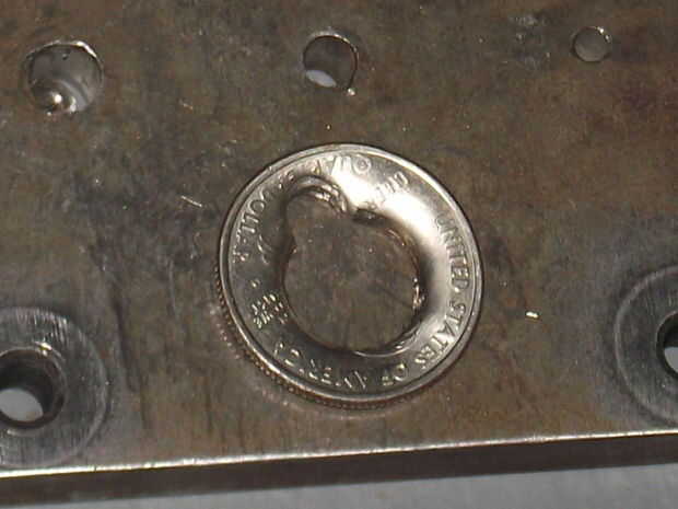 esto también es muy importante en donde usted coloque su orificio, no desea colocar fuera de todo grande, pero la cebada en él como se ve en la imagen de abajo. El orificio más pequeño, más pequeño los colmillos. Cuanto más grande el agujero, la más amplia y más se convertirá en los colmillos. Pero no cualquier tamaño más 3/8 pulg o su voluntad de anillo dividido en pasos posteriores. Esto no siempre es malo porque puedes el ajuste el tamaño de su anillo a cualquier cosa que te gusta. Pero si quieres que tu anillo con ninguna grieta, siga los pasos anteriores, que lo mismo se aplica a la perforación.