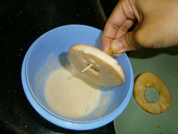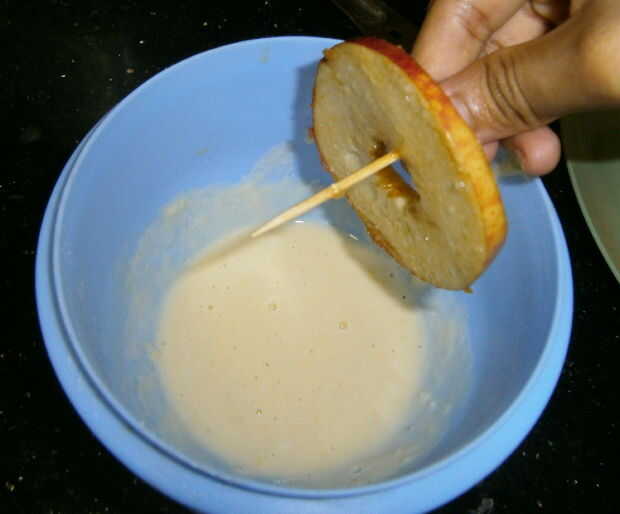 Sumergir las rebanadas de manzana en la masa.