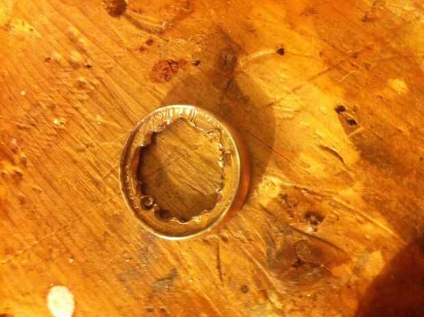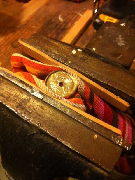 Tenga cuidado de no ir demasiado al borde de los anillos, de lo contrario el círculo del anillo terminado será desigual. Su moneda estará extremadamente caliente una vez que los agujeros se perforan para ejecutar por favor sentido común.