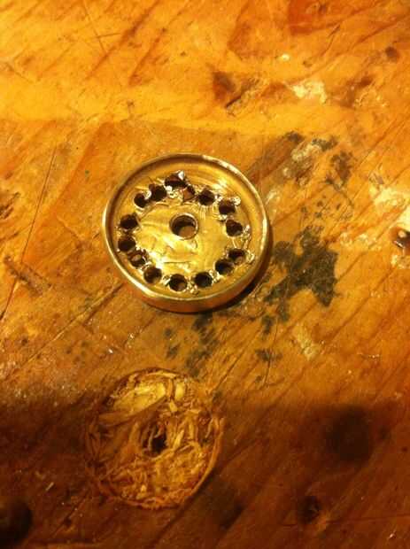 Apriete hasta que la moneda no cambiar cuando se aplica presión. Venir viene la diversión parte. Tome el taladro y taladrar agujeros alrededor del borde interior del anillo hasta puede quitar esa sección interna. Estoy seguro que hay una manera más fácil de hacer este (broca más grande) pero no tenía ganas de correr a la tienda y esto pareció funcionar.