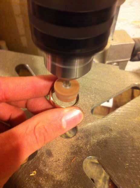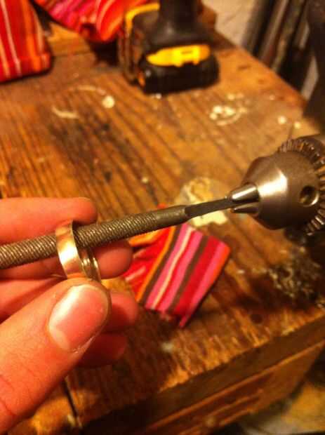 ¿Sabes esos archivos de cilindro? Bueno he pegado a una de esas en un taladro y para eliminar el material extra. Probablemente no la más segura (que lo hizo volar hacia fuera un par de veces) pero funcionó. Una vez que el agujero fue lo suficientemente grande, usé poco pulido de Dremel en una prensa del taladro y jugaba hasta que me dieron el aspecto que quería. El anillo tenía una tendencia a calentarse muy rápidamente, por lo que mantiene un tazón de aceite de Temple rápido cerca de utiliza a menudo.