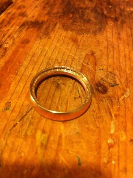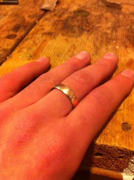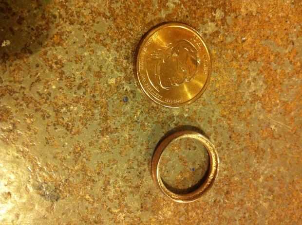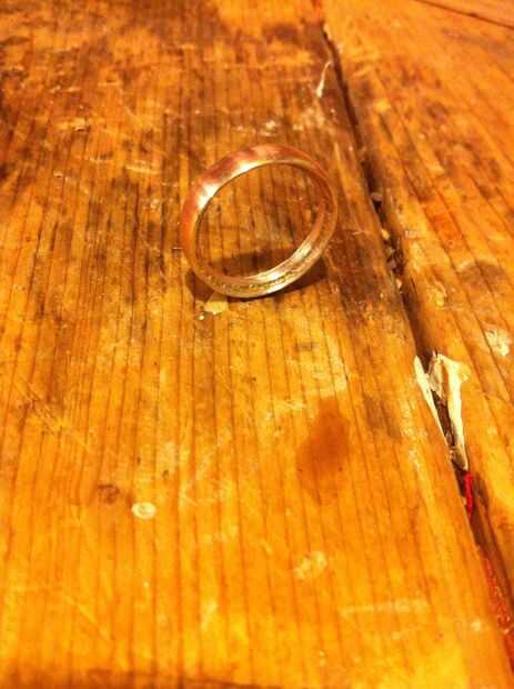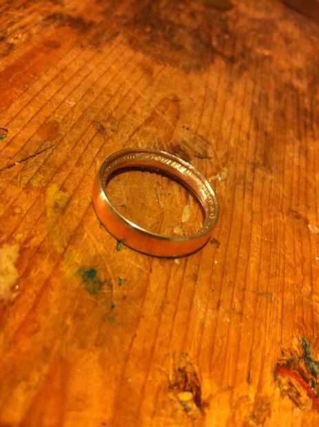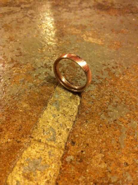 Si usted mira de cerca algunas de las fotos se puede ver una banda de metal de color cobre en el centro del anillo, pero se desvanece a la plata hacia el borde exterior. Muy guapo en la vida real.