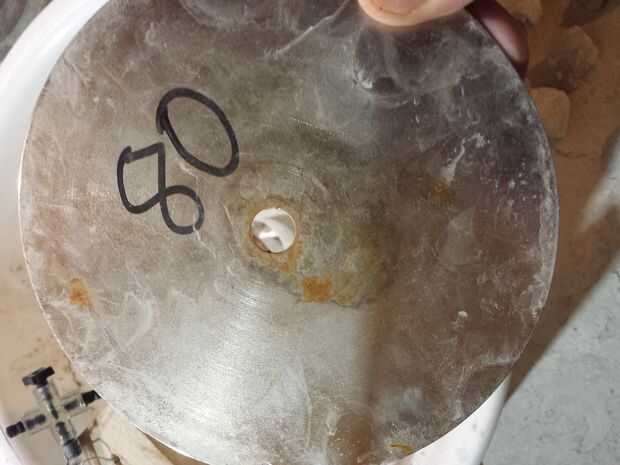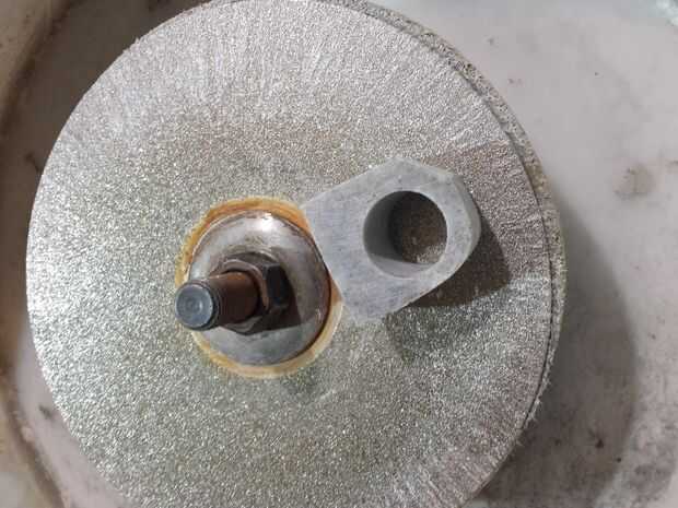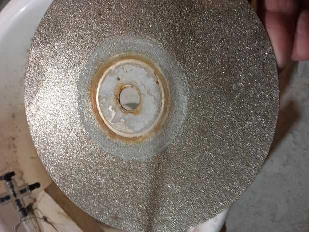 Es hora de empezar a formar el anillo de piedra. Yo uso una máquina plana lapidaria que construí yo mismo. Utiliza 6" diamante recubierto plana lapidarias discos de diferentes granos. Iniciar con un disco de curso. Estoy usando un disco de 80 grano. el anillo forma lentamente por contra los discos de pulir. no olvide su goteo de agua para control de enfriamiento y el polvo.