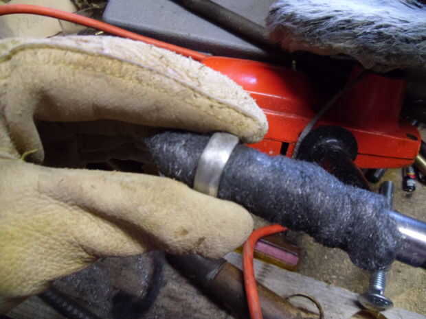 Ahora, si usted tiene una mejor idea o herramienta entonces usarlo pero aquí es lo que hice. Tomar una vieja broca más pequeña que el diámetro interior del anillo. Sujete el taladro. COLÓQUESE LOS GUANTES. Poco a poco trabajar la lana de acero sobre la broca hasta que usted tiene suficiente allí para que el anillo se ajusta cómodamente pero no demasiado apretado. Trabajar el anillo alrededor de como ejecutar el taladro. Esto será pulir el interior bastante buena.