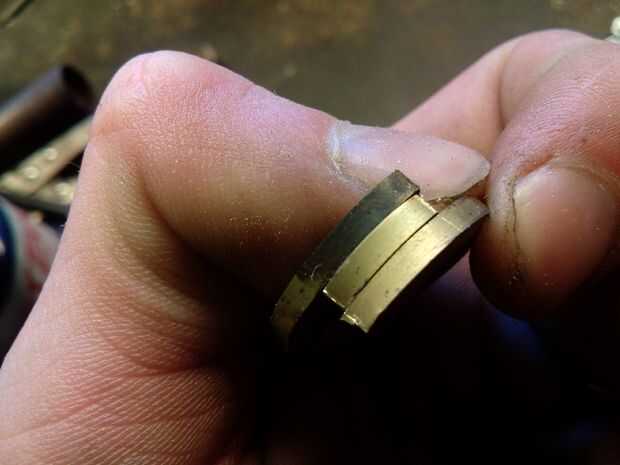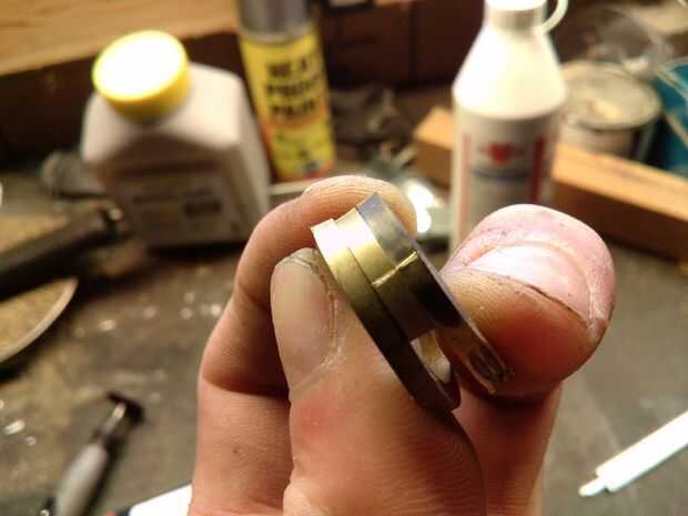 Cuando se encaja la pieza de oro, será demasiado largo y probablemente tienen algunos puntas feas. Pero la corte aún! En primer lugar, decidir qué tamaño debe ser la superposición. No necesariamente tiene que ser del tamaño lo hizo, que es hasta usted para decidir. Uno de los extremos de la plata es irregular de apretar a la toma, y el otro no será un círculo perfecto y dentados. Por lo tanto necesitará cortar ambos extremos y dejar la mejor pieza en el centro. Utilicé una pinza a una longitud específica para marcar dos líneas a la vez, con el pedazo de oro en ya. Así, se llega perfectamente emparejando piezas.