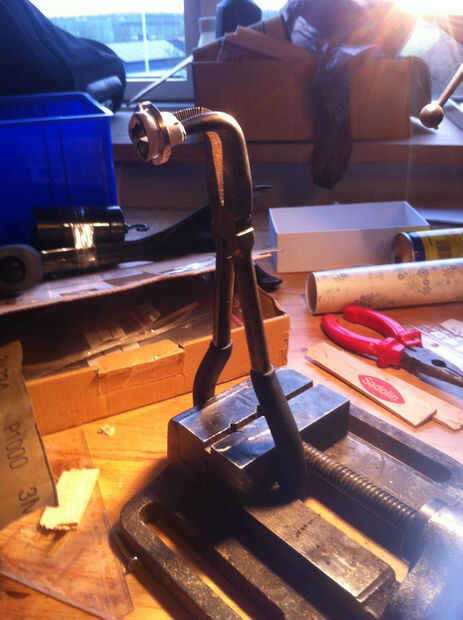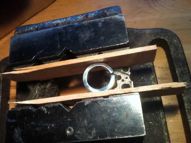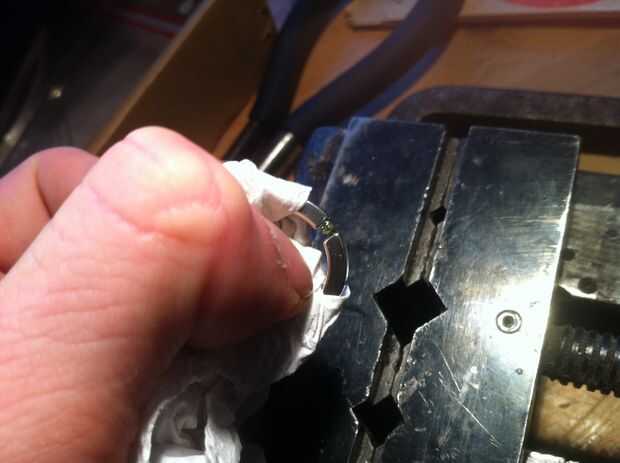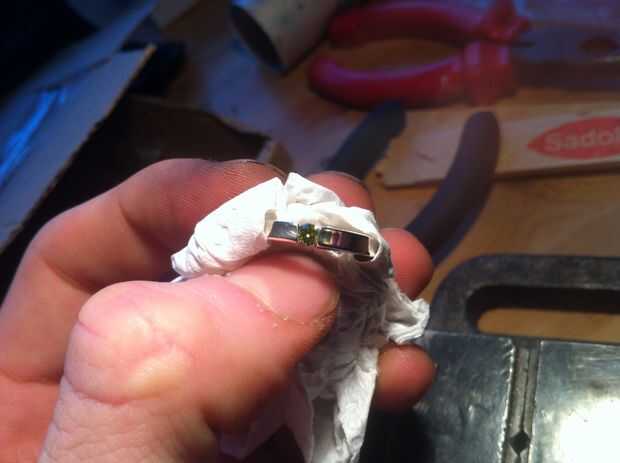 Para crear la tensión que sostiene la piedra, empezar por el anillo de sujeción y apriete modo que los extremos toquen. Luego abrirlo de nuevo, sólo lo suficiente para deslizarse en la piedra y mantener en su lugar. Hice una configuración demasiado compleja hacerlo, pero era sólo porque estaba sola en casa, si tienes alguien que le ayude no es complicado. También es muy satisfactorio escuchar ese chasquido luego