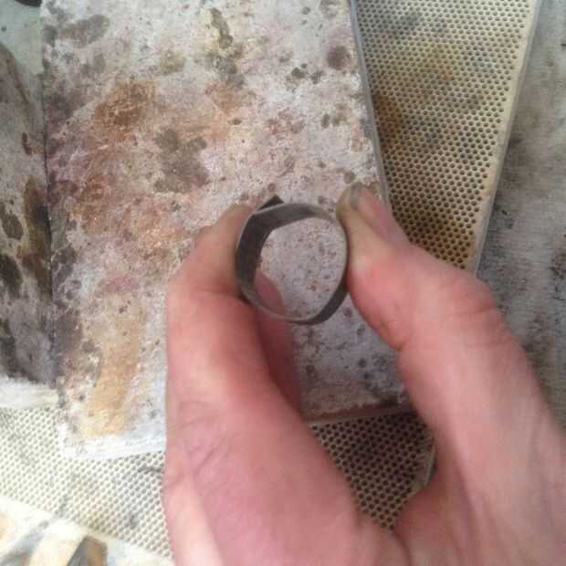 Me había recocido el anillo varias veces y utiliza un par de tenazas redondas y un mazo de goma para base redonda. Entonces flexiona cada borde bajo unos a otros así que surgirían en su posición. Cuando los extremos se toquen me encontré un archivo entre los dos como en la imagen. Como se puede ver en la última foto hay un pequeño espacio. Seguía corriendo el archivo entre los dos hasta que fueron al ras.